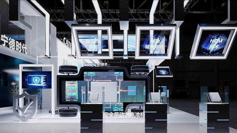 展台顶部的品牌标识采用巨型发光字设计,“CATL” 英文标识与 “宁德时代” 中文名称并置排布,总体在黑色桁架背景的衬托下形成强烈视觉冲击,以确保品牌信息在复杂的展会环境中-实现高效触达。